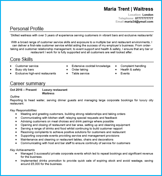 Waitress Or Waiter Cv Example With Writing Guide And Cv Template